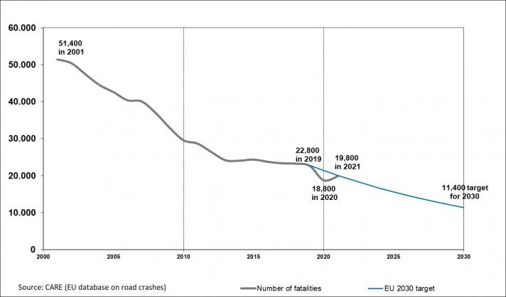Az EU 2030-ra 50%-os csökkenési célt tűzött ki a közúti halálesetek – és első ízben a súlyos sérülések – visszaszorítására. 2019-ben az Európai Bizottság az itt bemutatott európai közúti közlekedésbiztonsági célokat tűzte ki. Az Európai Parlament 2021 októberében állásfoglalást fogadott el, amelyben a közúti közlekedés biztonságának javítását és a zéró halálozási cél 2050-ig történő elérését tűzte ki célul. Az állásfoglalás ajánlásokat tartalmaz biztonságosabb járművekre, viselkedésekre és infrastruktúrára vonatkozóan.