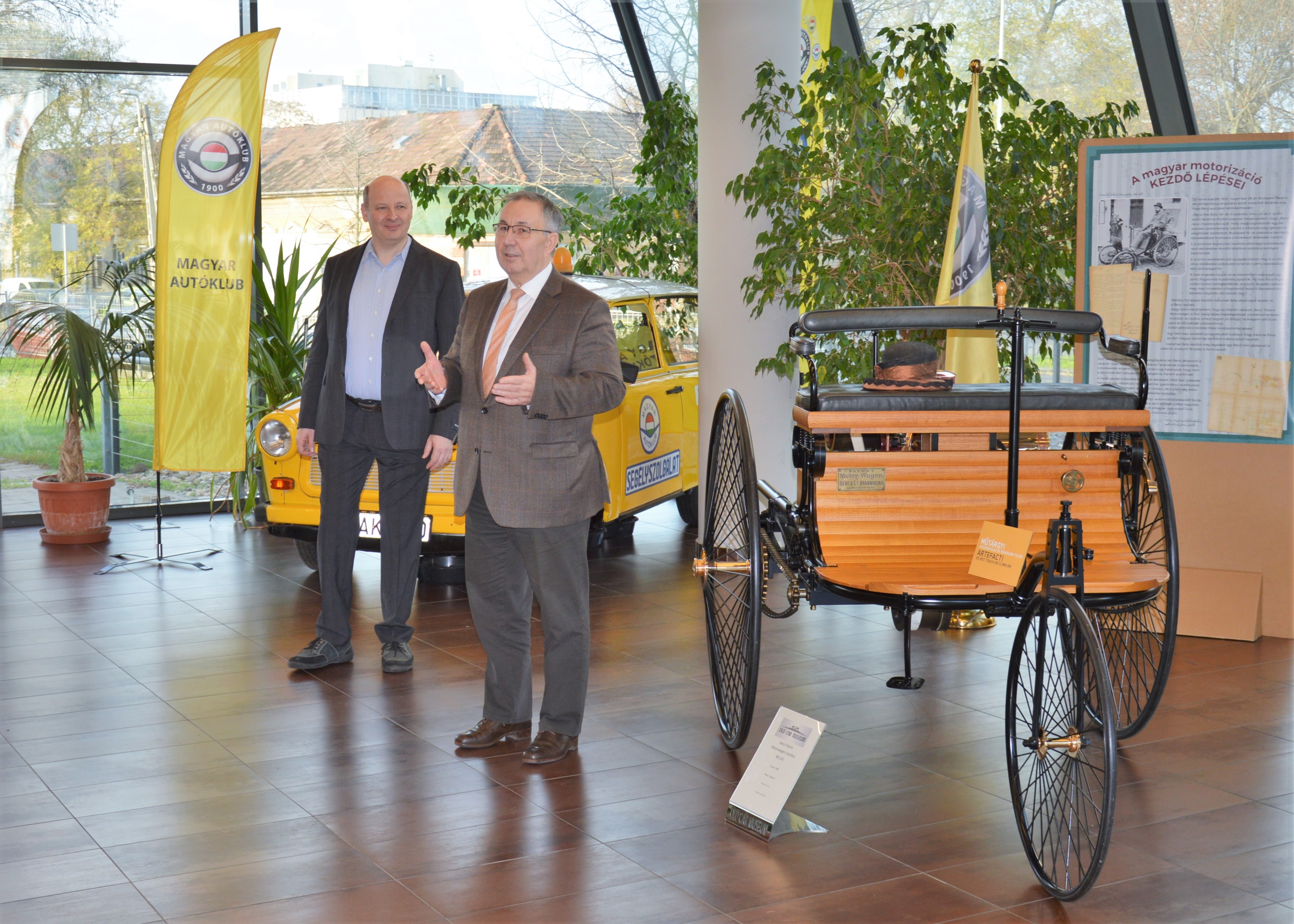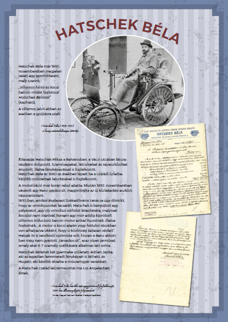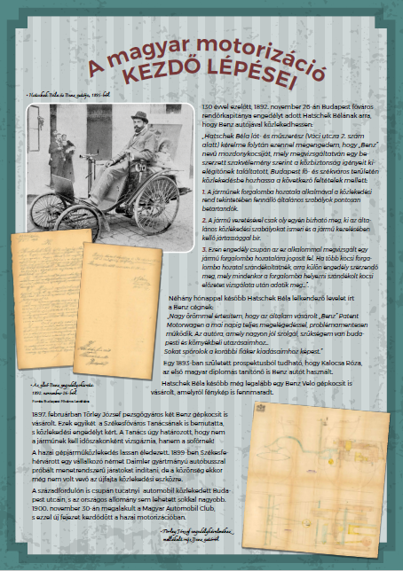 Éppen 130 esztendeje, 1892. november 26-án íródott az a levél, melyben Budapest rendőrkapitánya hozzájárulását adja Hatschek Béla lát- és műszerésznek ahhoz, hogy „Benz mozdonykocsiját” használhassa a városban. Ennek apropóján rendhagyó kiállítást szervezett a Magyar Autóklub, ahol látványos fényképek, szöveges ismertetők és egy Benz Patent-Motorwagen-másolat segítségével bepillantást nyerhetnek a látogatók a forgalmi engedély, valamint a századelő közlekedésének történetébe.