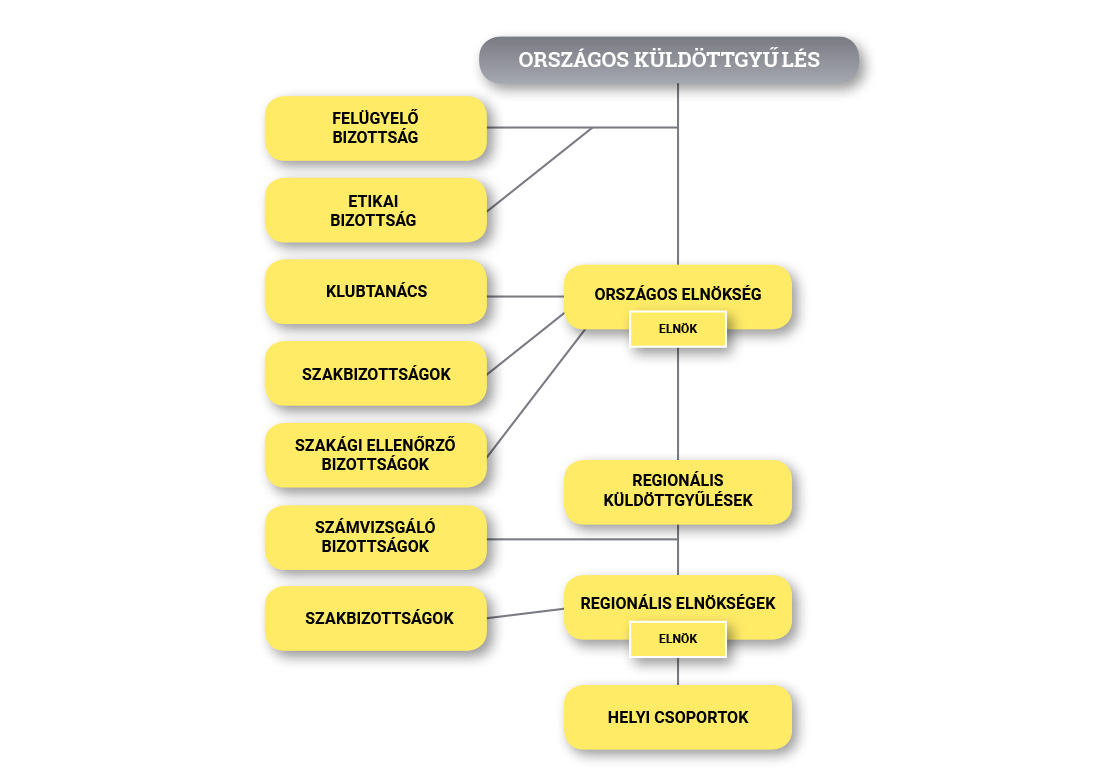 Az Országos Elnökség a Klub általános ügyintéző és képviseleti szerve. A Klub eredményes kormányzása érdekében gyakorolja a Küldöttgyűlésének fenn nem tartott hatásköröket. Az Országos Elnökség különösen: megállapítja az összeférhetetlenség eseteit, differenciált tagdíj-, illetőleg szolgáltatási rendet határoz meg, felülvizsgál regionális szintű döntéseket, összehangolja a regionális szervezetek tevékenységét és gondoskodik az Alapszabály 2. §-ában foglalt alapelvek érvényesítéséről.